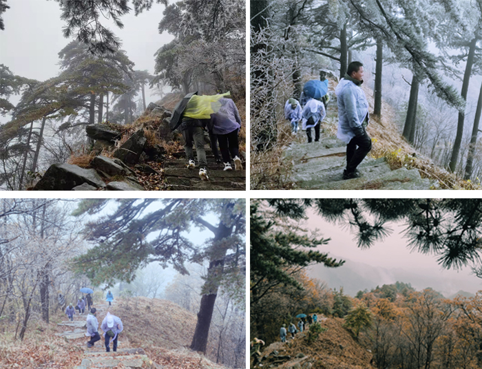 11月7日清晨天气骤变,山间雨淅淅沥沥地下着,寒风凛冽,但这并没能阻止我们一致攀爬大别山主峰白马尖的决心。毅行中漫山松翠映入眼帘,层林浸染,穿插着的打卡任务,让我们齐头并进。当遇体力透支的同事时,大家相互搀扶鼓励。登山过程中,团队内部之间的沟通与协作,充分体现了群策群力的力量和团结的精神。